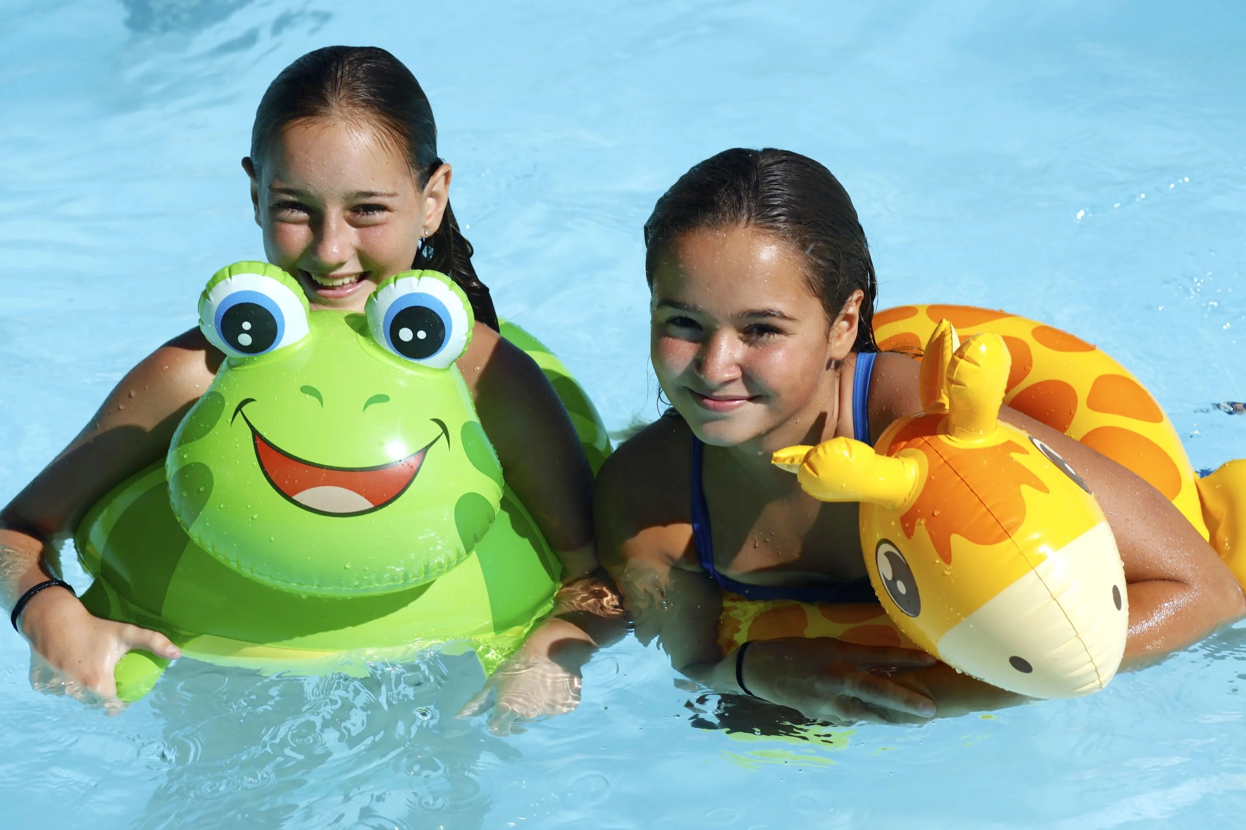Modest one-piece bathing suits (no cutouts) for girls, and fingertip length swim trunks for boys are required.